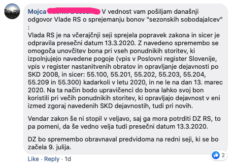 Objavljam tudi odgovor Vlade RS glede sprejemanja bonov sezonskih sobodajalcev, ki ga je objavila gospa Mojca na FB: